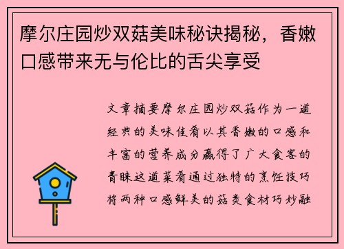 摩尔庄园炒双菇美味秘诀揭秘,香嫩口感带来无与伦比的舌尖享受