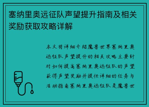 塞纳里奥远征队声望提升指南及相关奖励获取攻略详解